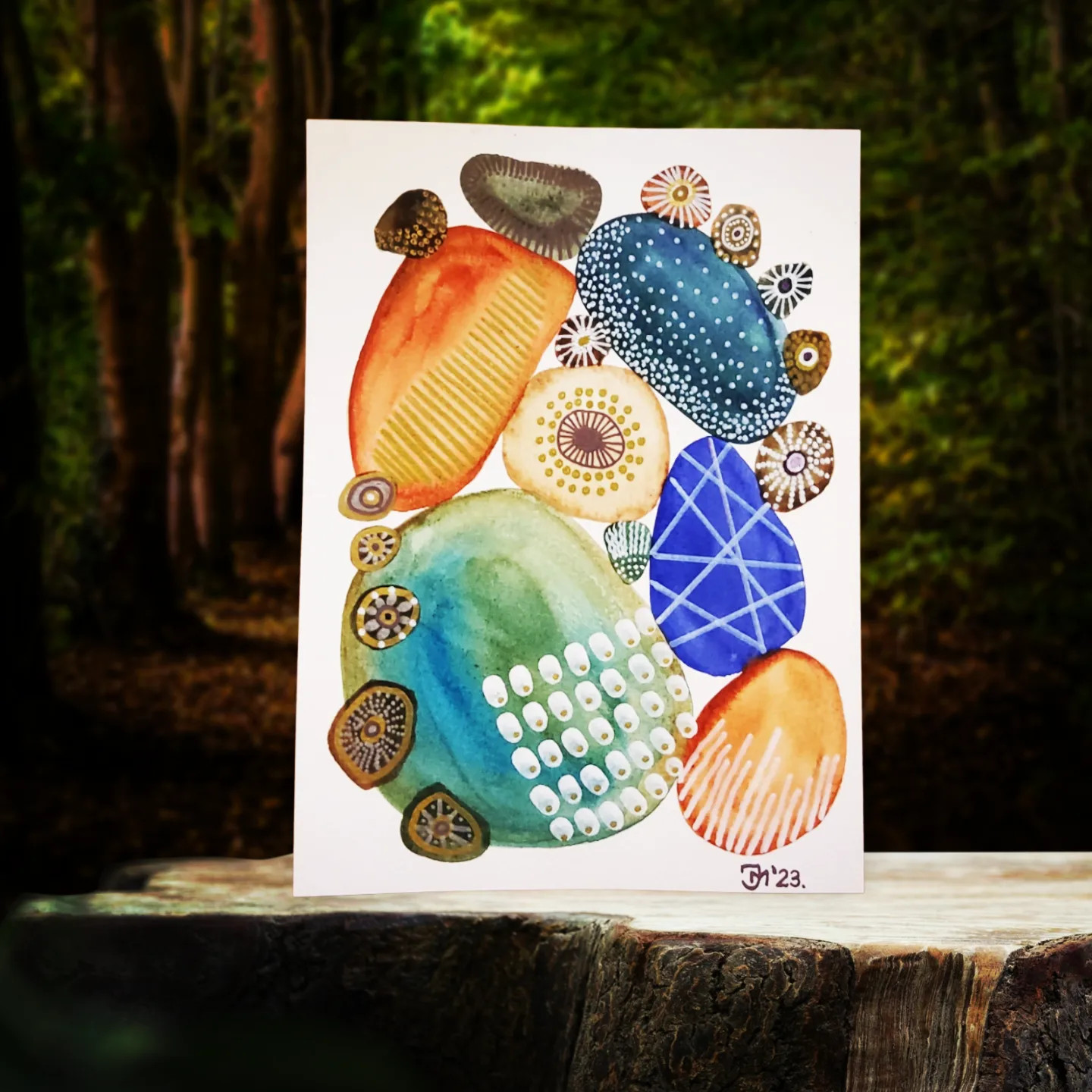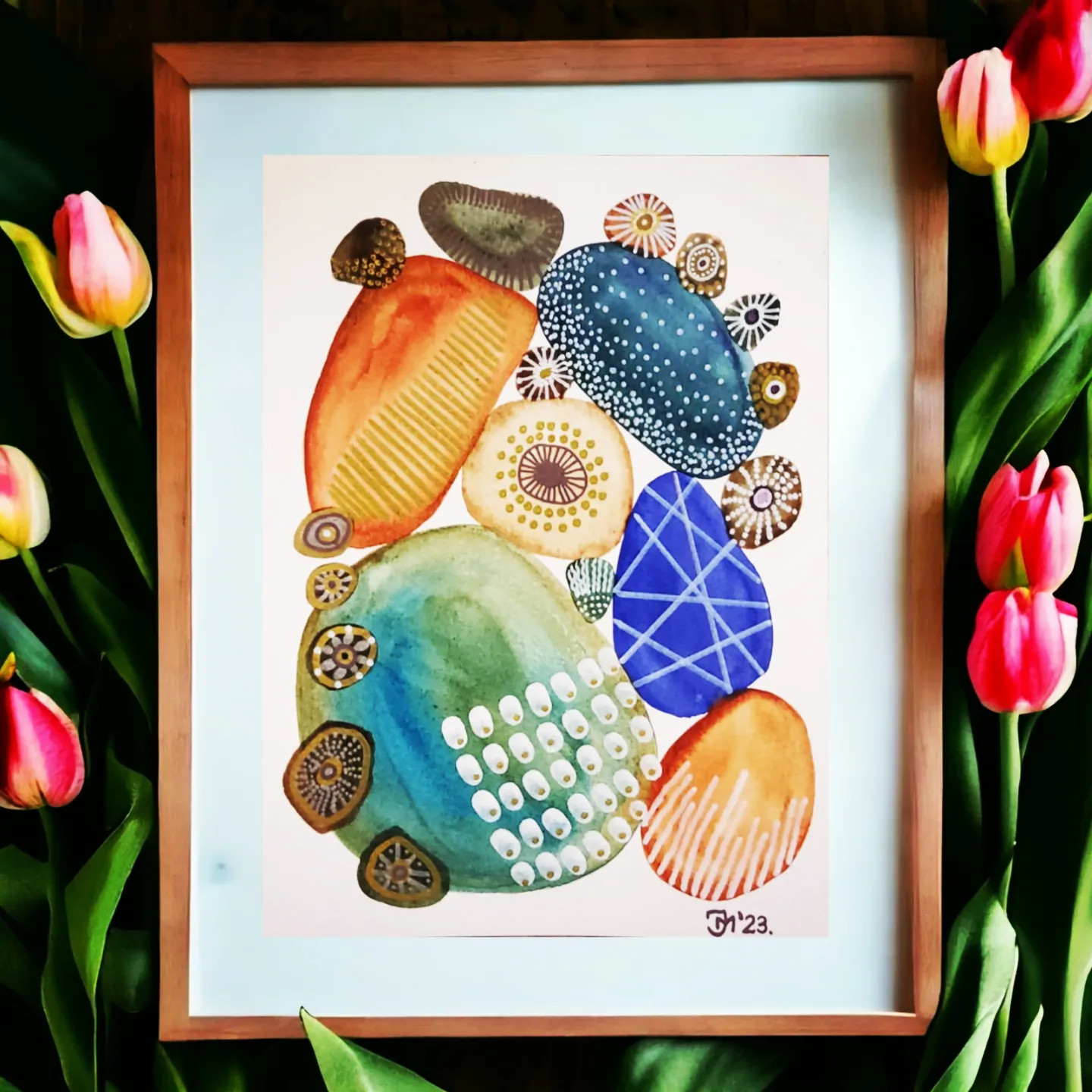 Colorful pebbles (19x26) - Aquarel and mixed media on cotton paper - Abstract work by Marzena Jotson