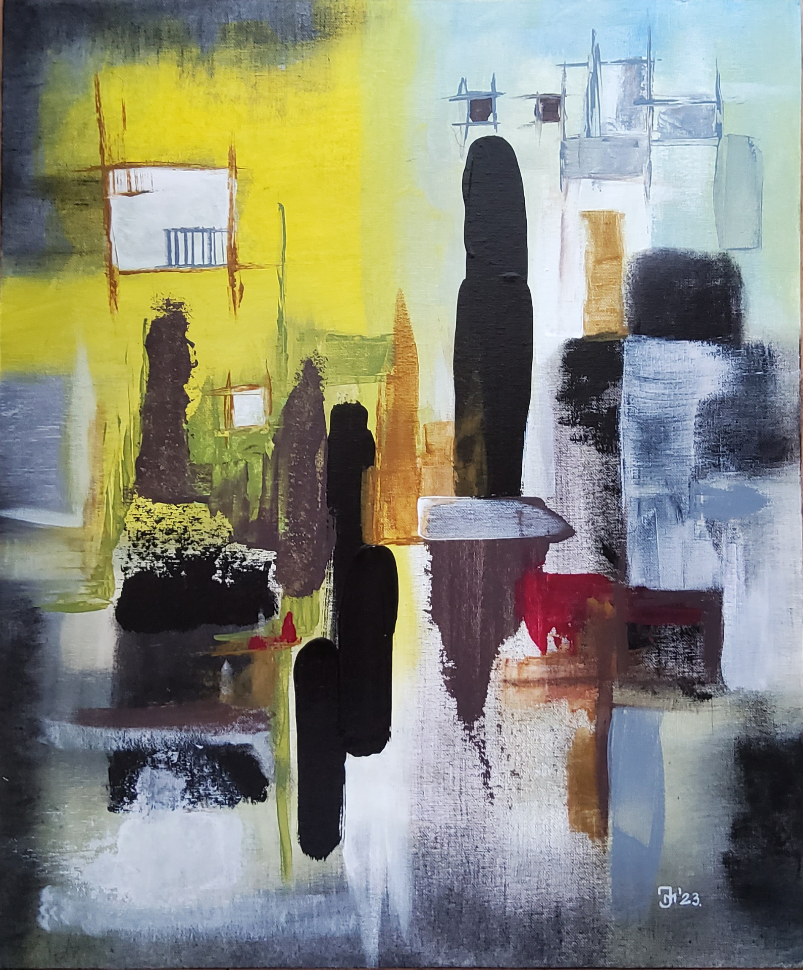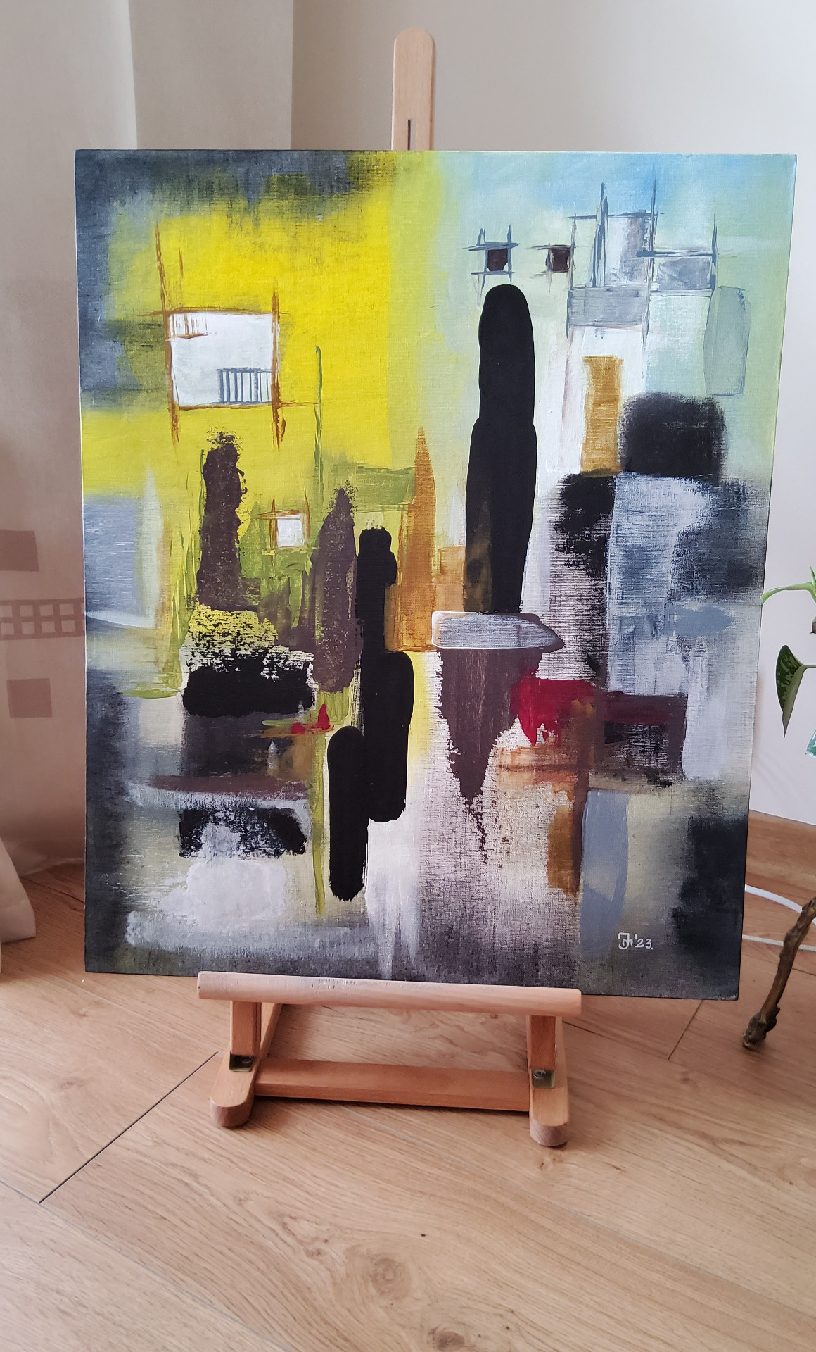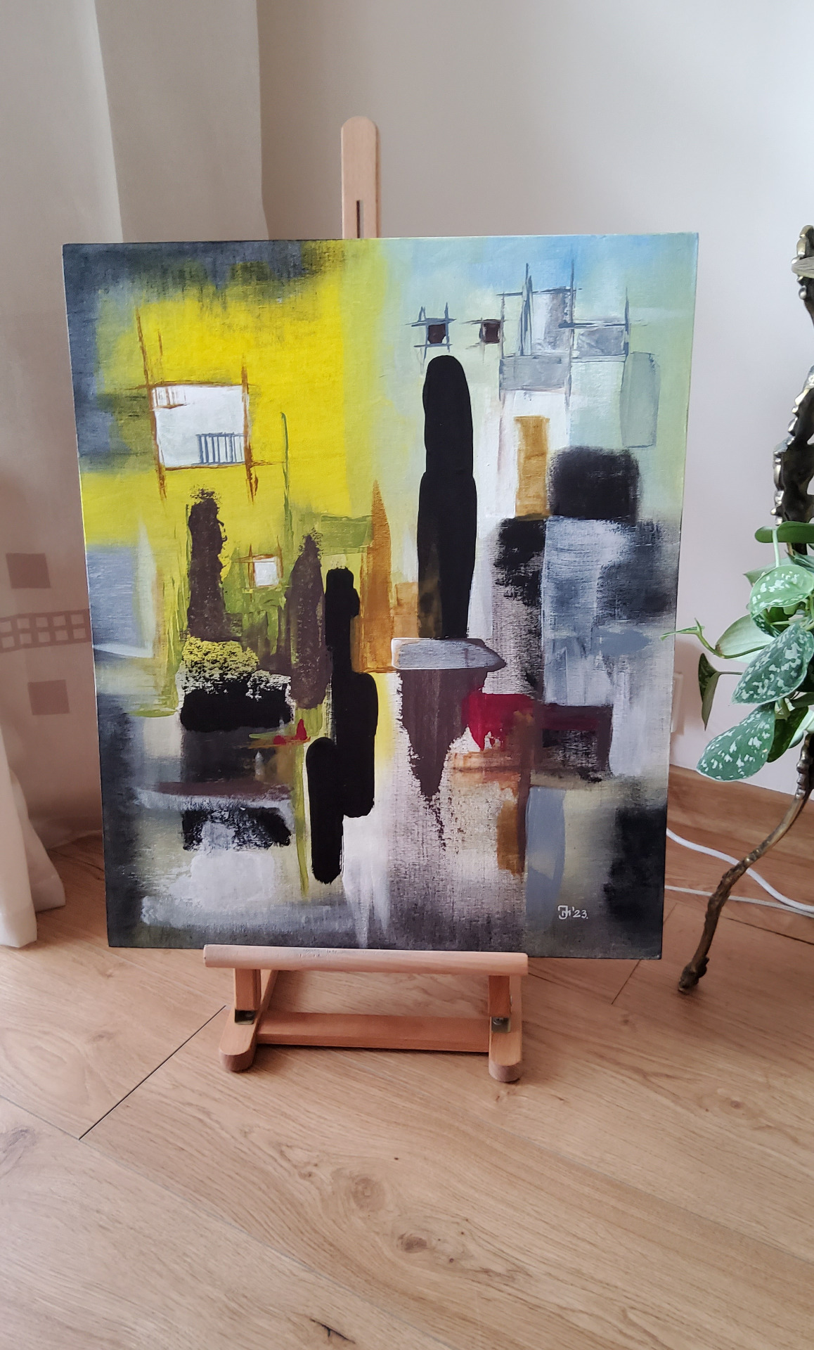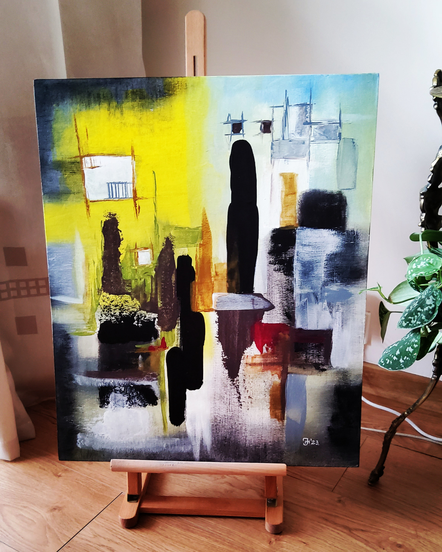 "The Bustle of the Big City". Acrylic on 100% cotton MDF, triple primed, 50×60cm, varnished.
