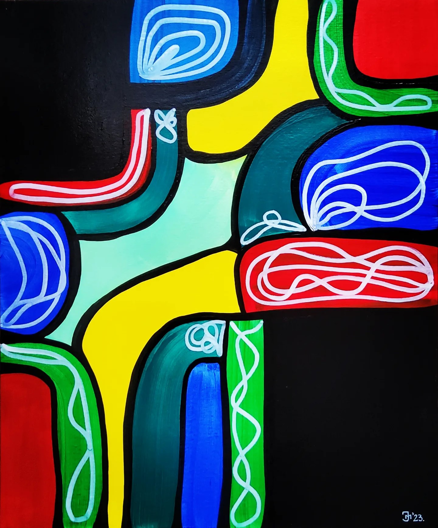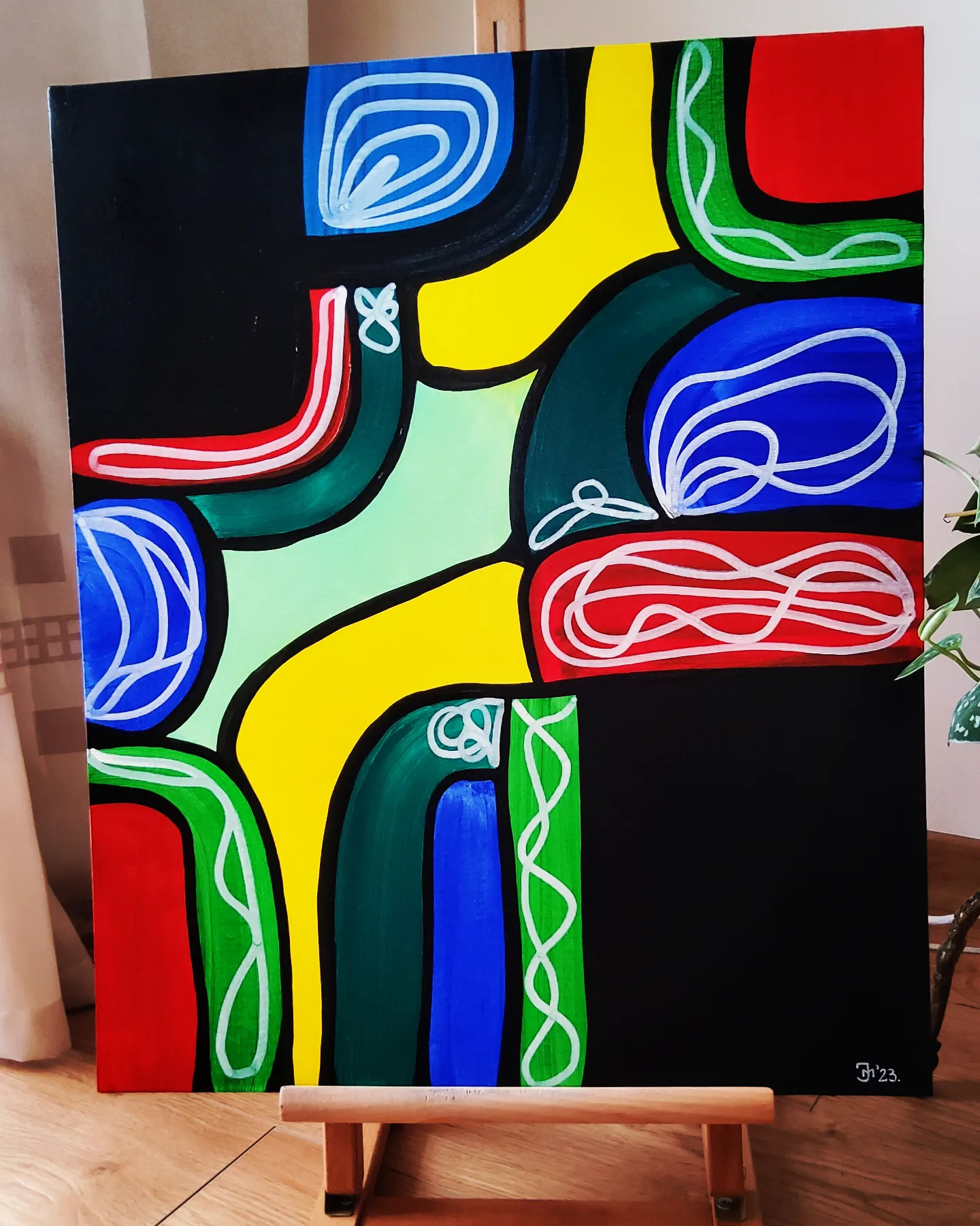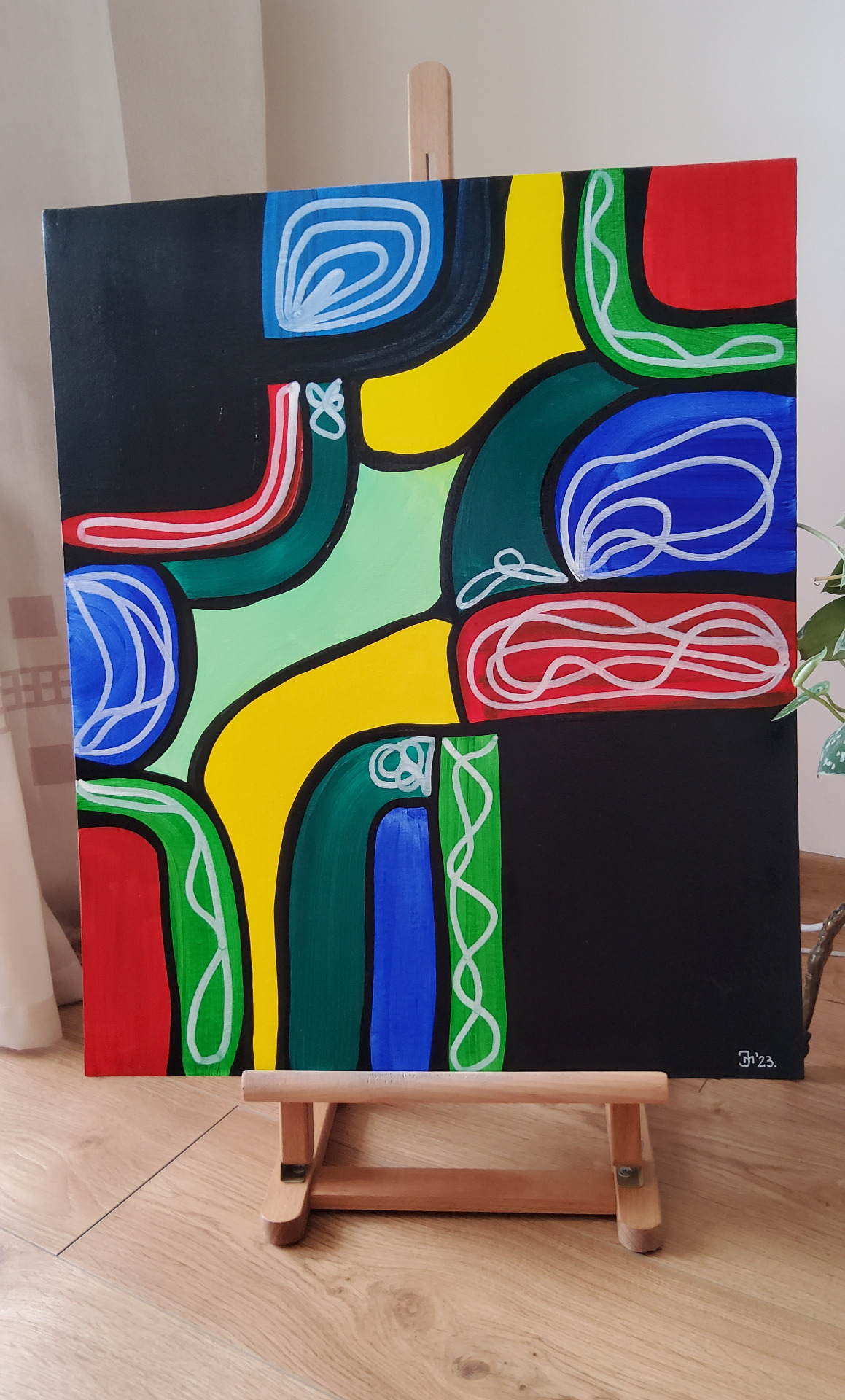 "Toy Boxes". Acrylic and mixed media on 100% cotton MDF, triple primed, 50×60cm, protected with varnish.